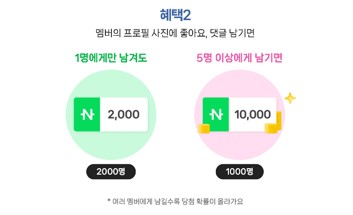 네이버 밴드 프로필 사진을 변경만 해도 10,000원을 준다고 합니다. 1,000명에게 주는 거면 나도 당첨될 확률이 꽤나 높지 않을까요? 그리고 내가 가입한 밴드에 있는 다른 회원에게 프로필 사진 좋아요와 댓글을 남기면 2,000명에게 네이버페이 2,000원을 준다고 합니다. 네이버 페이는 현금과 동일한 거 다들 알고 계시죠? 5명에게 남기면 10,000원이라고 하니 참여해보세요. 5명에게 남기는 거 정말 쉬운 일이 잖아요.