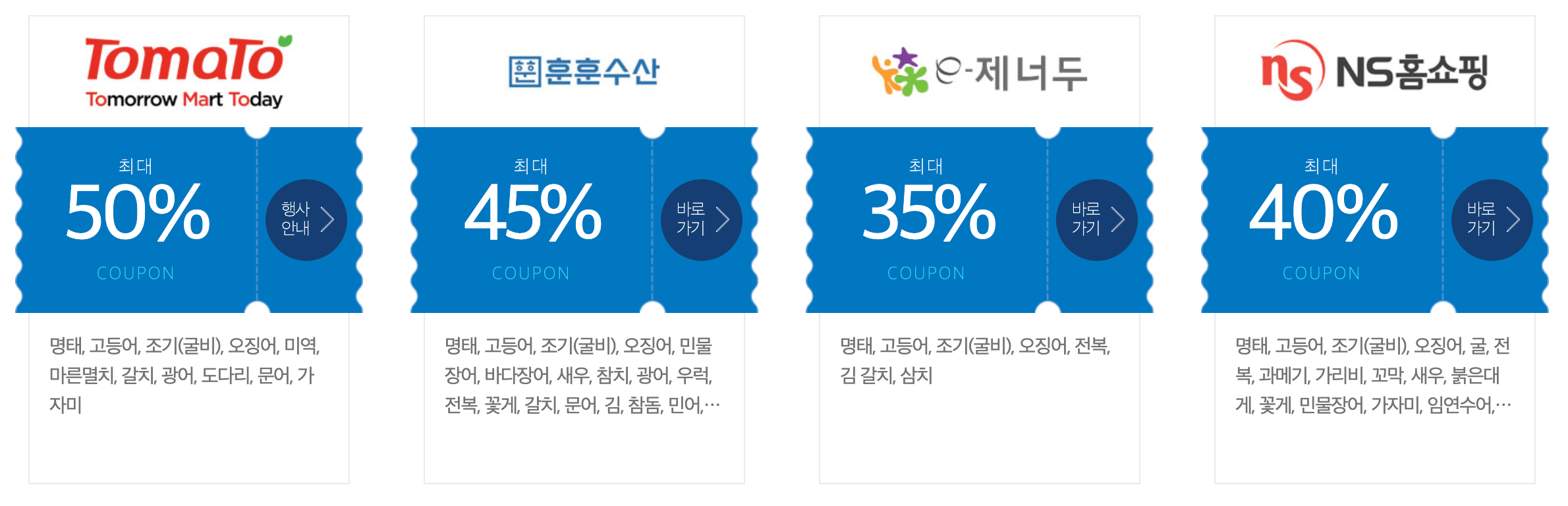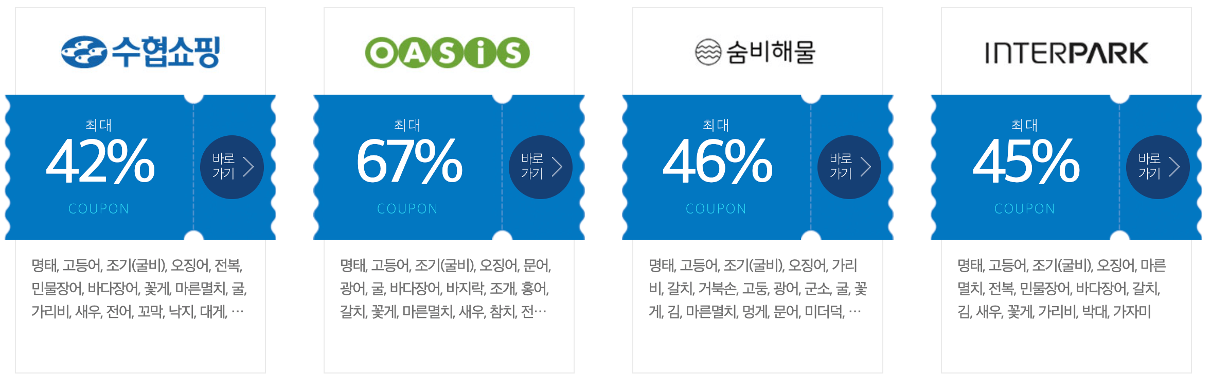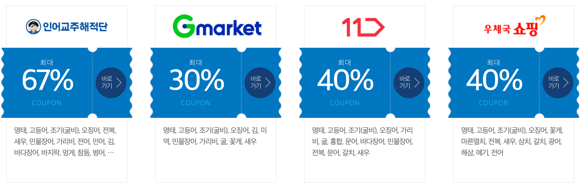업체별로 명태, 고등어, 조기, 오징어, 굴비, 굴, 전복, 꽃게, 새우, 갈치, 마른멸치, 미역, 다시마, 가리비, 홍합, 광어, 해초, 문어 등 다양한 수산물을 할인하고 있습니다. 업체마다 할인 항목이나 할인율이 다르기 때문에 꼼꼼히 살펴보시고 가장 할인율 좋은 곳에서 구매하시기 바랍니다.