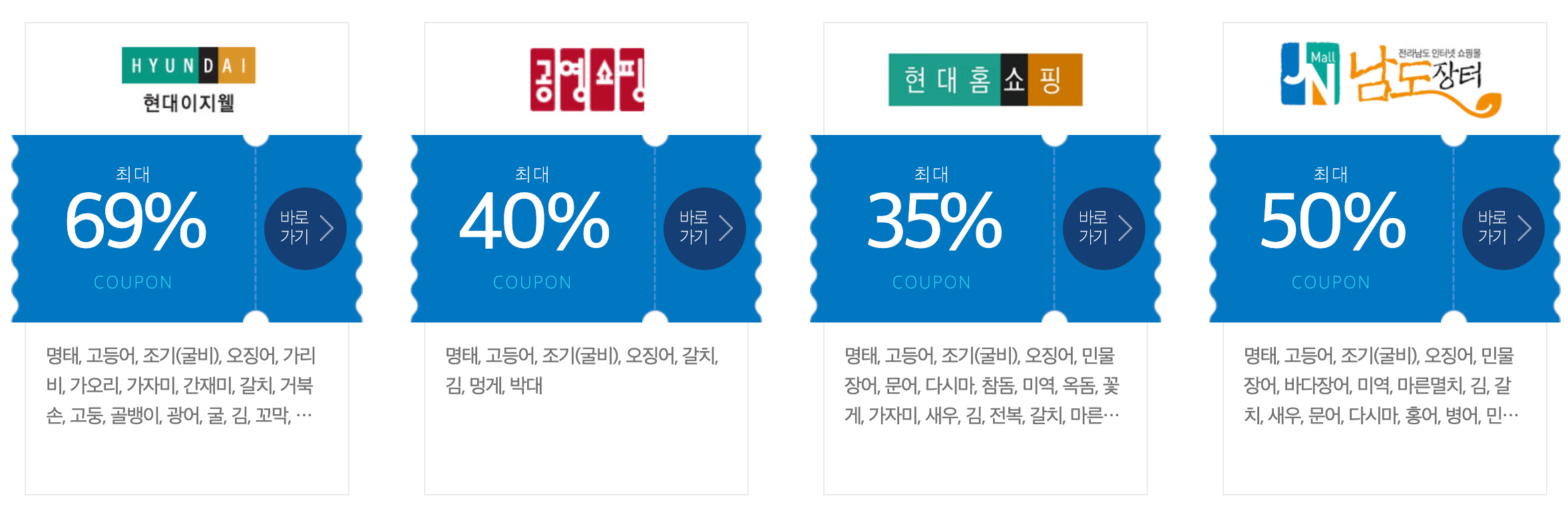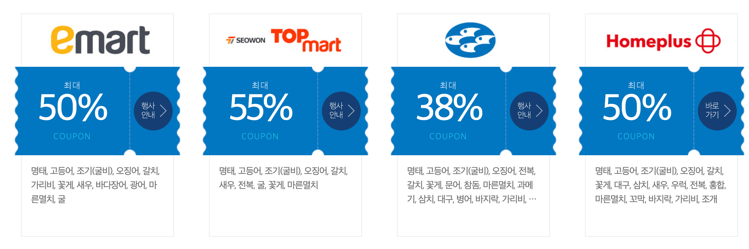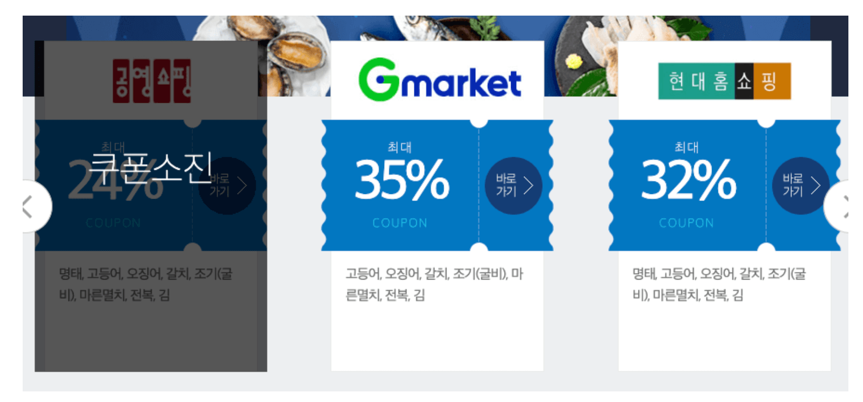 업체별로 명태, 고등어, 조기, 오징어, 굴비, 굴, 전복, 꽃게, 새우, 갈치, 마른멸치, 미역, 다시마, 가리비, 홍합, 광어, 해초, 문어 등 다양한 수산물을 할인하고 있습니다. 업체마다 할인 항목이나 할인율이 다르기 때문에 꼼꼼히 살펴보시고 가장 할인율 좋은 곳에서 구매하시기 바랍니다.