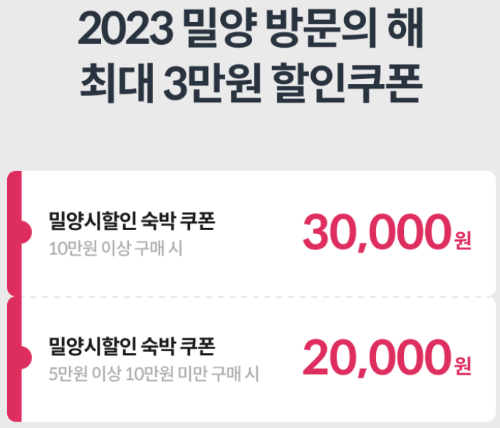 10만 원 이상 숙소에 묵는다면 30,000원 짜리 숙박 쿠폰을 사용할 수 있고, 5만원 이상 10만원 미만 숙소에 묵는다면 20,000원짜리 숙박 쿠폰을 사용할 수 있습니다.