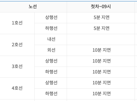 아래 1호선-9호선 지연증명서를 눌러서 들어가보시면 이런식으로 지연 시간이 표시되어 있습니다. 해당 구간의 지연 시간을 클릭하면 지연 증명서를 발급받을 수 있습니다.