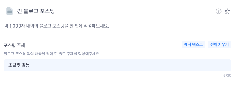 요즘은 블로그 포스팅을 할 때도 chat gpt를 이용하는 분들이 많은데 그럴 경우에 명령어를 구체적이고 자세히 쓰지 않으면 오류가 나는 경우도 많습니다. 그러나 뤼튼에는 아예 긴 블로그 포스팅이라는 틀이 있기 때문에 이것을 이용하면 더 편하게 쓸 수 있습니다.