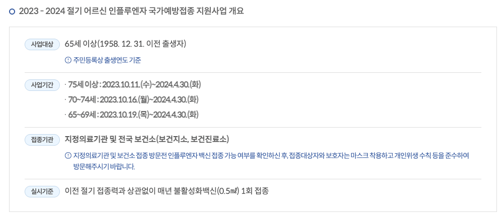 ✔️ 만 65세부터 69세는 2023년 10월 19일부터 무료 예방 접종이 가능하며,