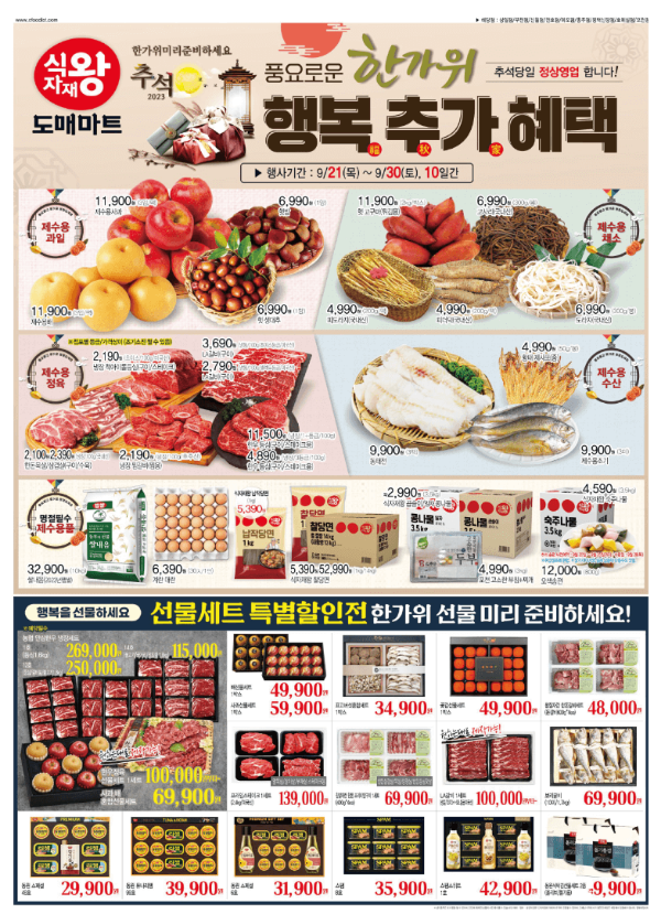 마지막으로 E왕마트 식자재왕 도매마트 추석 전단행사 알려 드리니 참고하셔서 추석 선물세트나, 고기, 생선, 채소 등 필요한 식자재 저렴하게 구매하시기 바랍니다. 쿠폰도 꼭 받아서 할인 더 받으세요.