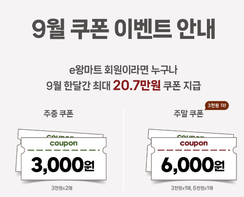 e왕마트는 원래도 저렴하게 식자재를 판매하지만, 쿠폰 이벤트도 정말 좋습니다. 현재 진행중인 E왕마트 쿠폰 이벤트 알려 드립니다. 9월 쿠폰 이벤트는 한달간 최대 20.7만원을 받을 수 있는 이벤트입니다. 매주 3천원 쿠폰을 2장 증정하며, 주말에는 3천원을 더 증정하는 6,000원 쿠폰을 증정하고 있습니다.