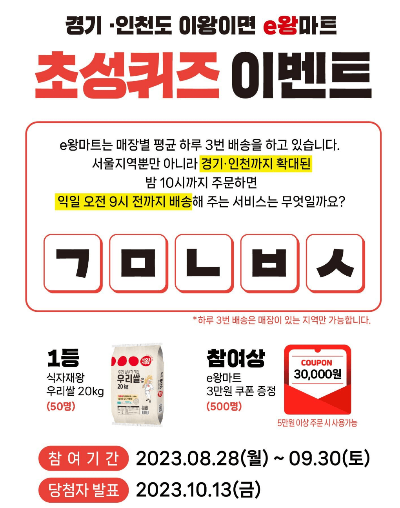 딱 지금 E왕마트 초성 맞추기 이벤트 참여하시면 1등에게 우리쌀 20kg를 증정합니다. 1등 쌀 20kg는 무려 50명이나 되기 때문에 한 번 도전해볼만 합니다. 참여상도 3만원 쿠폰인데 500명이나 주기 때문에 3만원은 충분히 받을 수 있을 것 같습니다.